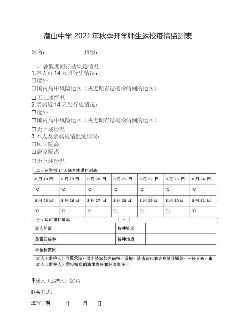 附:潜山中学2021年秋季开学师生返校疫情监测表