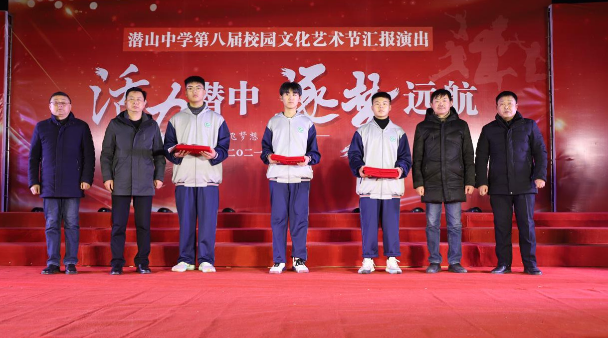 主持人宣布潜山中学2021年校园文化艺术节各项比赛获奖班级和学生名单,校领导为获奖班级和个人颁奖。