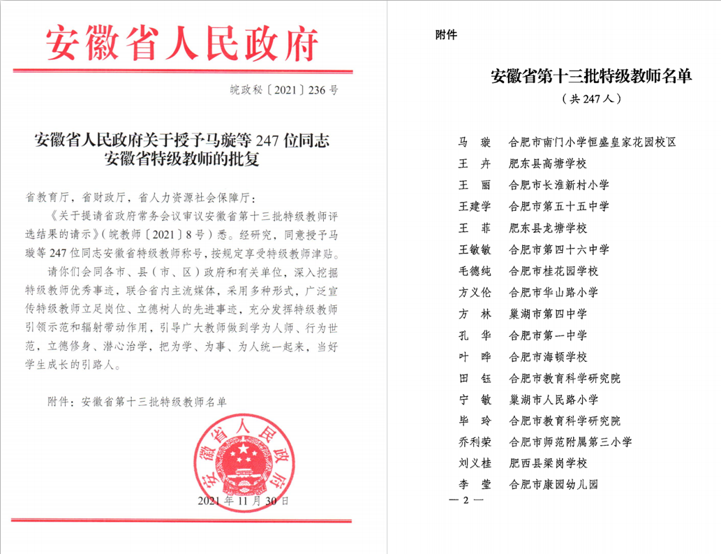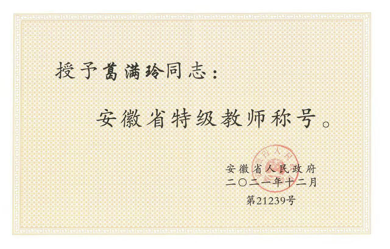 在安徽省第十三批特级教师评选表彰工作中,我校葛满玲老师被授予特级教师称号。