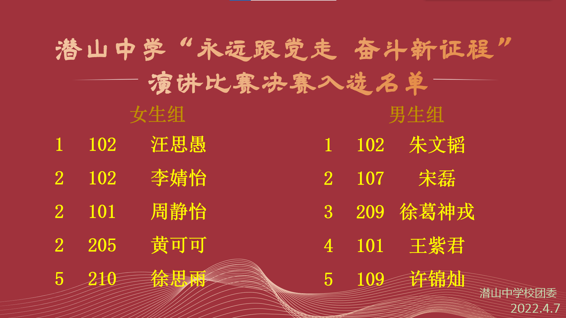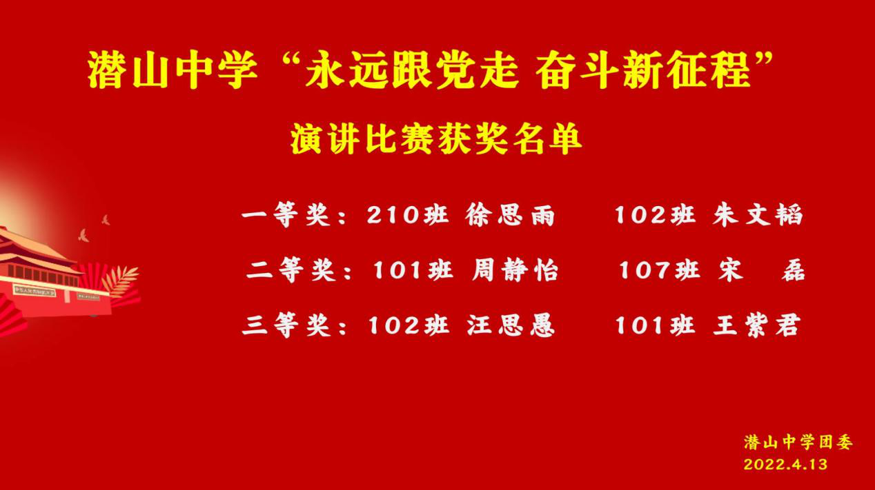 2022年4月,为响应第28届全市青少年爱国主义读书教育活动,引导学生积极培育和践行社会主义核心价值观,弘扬学生的家国情怀与奋斗精神,潜山中学团委隆重举办“永远跟党走 奋斗新征程”主题征文及演讲活动。