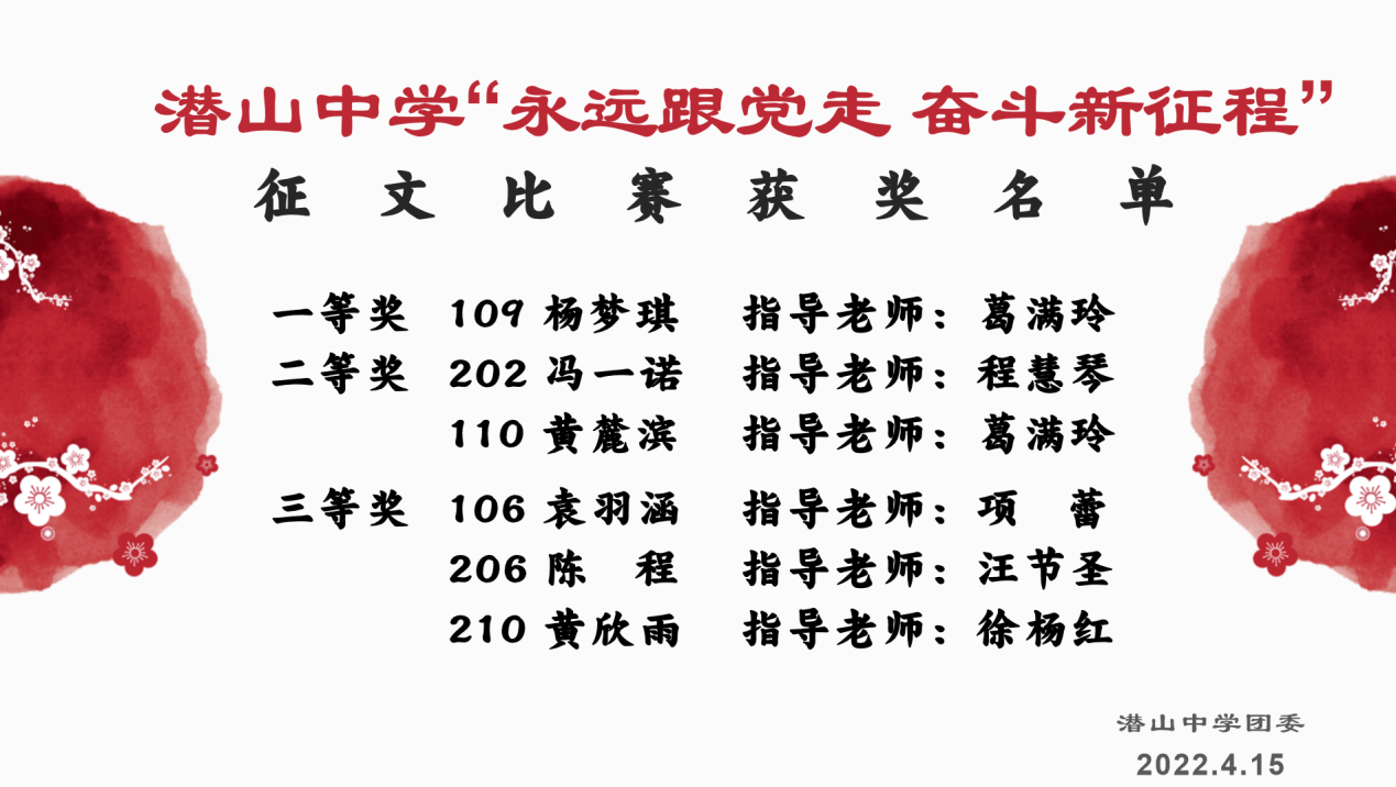 本次征文比赛,同学们热情极高,参赛踊跃,共收到稿件70多篇。4月14日,经过潜山中学专家组的公正、审慎的评稿,最终评选出一等奖1名,二等奖2名,三等奖3名。