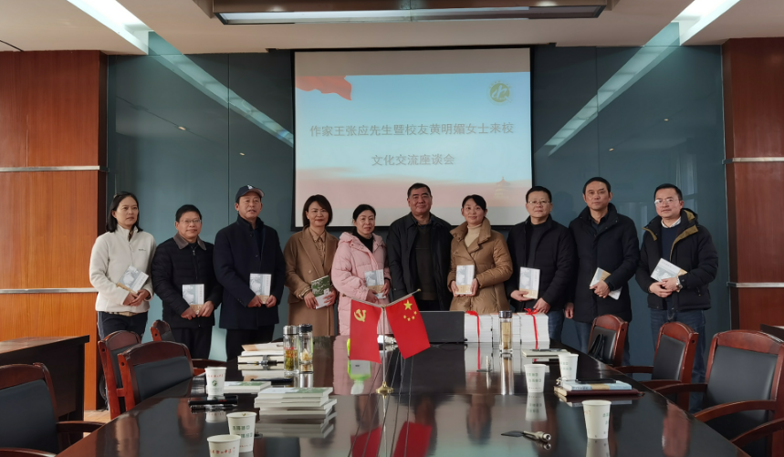 12月11日,作家王张应,潜山中学校友、安徽中淼公司总经理黄明媚,安徽中医药大学教授万四妹一行来我校开展文化交流活动,安徽省张恨水研究会秘书长朱显亮、潜山市教育局基教股原股长徐英权陪同,潜山中学副校长徐舒曼主持交流活动。