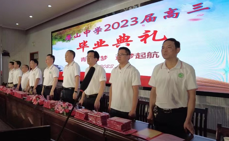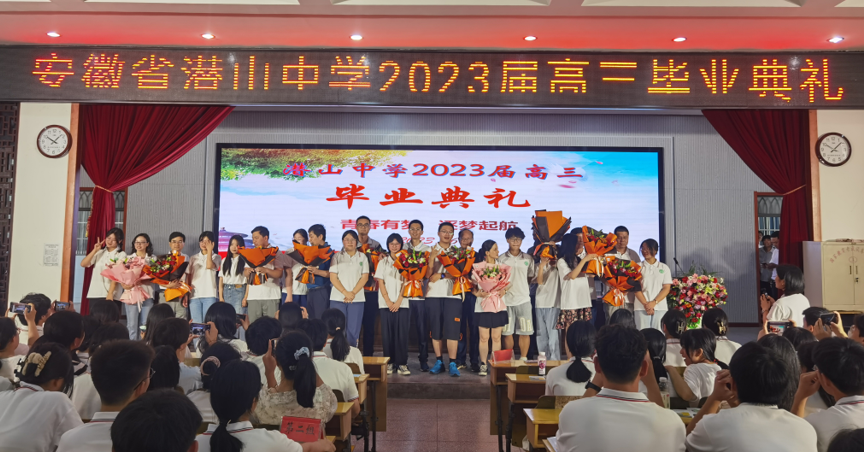 2023 年6月11日 青春有梦 筑梦起航 ——潜山中学举行2023届高三毕业典礼 6月9日上午,潜山中学在逸夫楼报告厅举行2023届高三毕业典礼。校党总支书记徐爱民、副校长葛良苗、党总支副书记张永生、各科室负责人以及高三全体班主任出席大会,高三全体学生参加大会,大会由葛良苗主持。 大会在庄严的国歌声中隆重拉开帷幕,全体起立唱响国歌。张永生宣读潜山中学2022—2023学年度表彰决定。桂方胜宣读2022—2023学年度高三“优秀学生干部”“优秀团干”和“三好学生”名单。获奖同学上台领奖并合影留念。 310班学生代表李亚峰上台发表毕业感言,感谢老师们三年来的辛勤付出,号召同学们振奋精神再出发。 高三教师代表许爱武在发言中细数了三年高中生活的点滴回忆,鼓励同学们拥抱美好未来。既要勇敢探索,积极进取,也要心怀感恩,常回家看看。 在许老师情真意切的发言后,各班学生代表上台为班主任鲜花。每一朵鲜花里都饱含深情与感恩,三年谆谆教诲,一生受益无穷,铭记师恩,此生难忘。 在鲜花与师恩的馨香中,徐爱民书记致辞。他以“莫愁前路无知己,天下谁人不识君”“竹杖芒鞋轻胜马,一蓑烟雨任平生”“落其实者思其树,饮其流者怀其源”三句古诗,表达对本届毕业生的殷切期望,,希望同学们有勇敢之志,携进取之意,怀感恩之心,勇当后浪,奔流不息。 最后,由302班葛徐冉带领全体高三学生朗诵《少年中国说》。在激烈昂扬的气氛中,本次大会圆满结束。 一鸣从此始,相望青云端。愿同学们金榜题名,前程似锦! (文字/程慧琴 图片/余玲 程慧琴 审核/徐爱民)