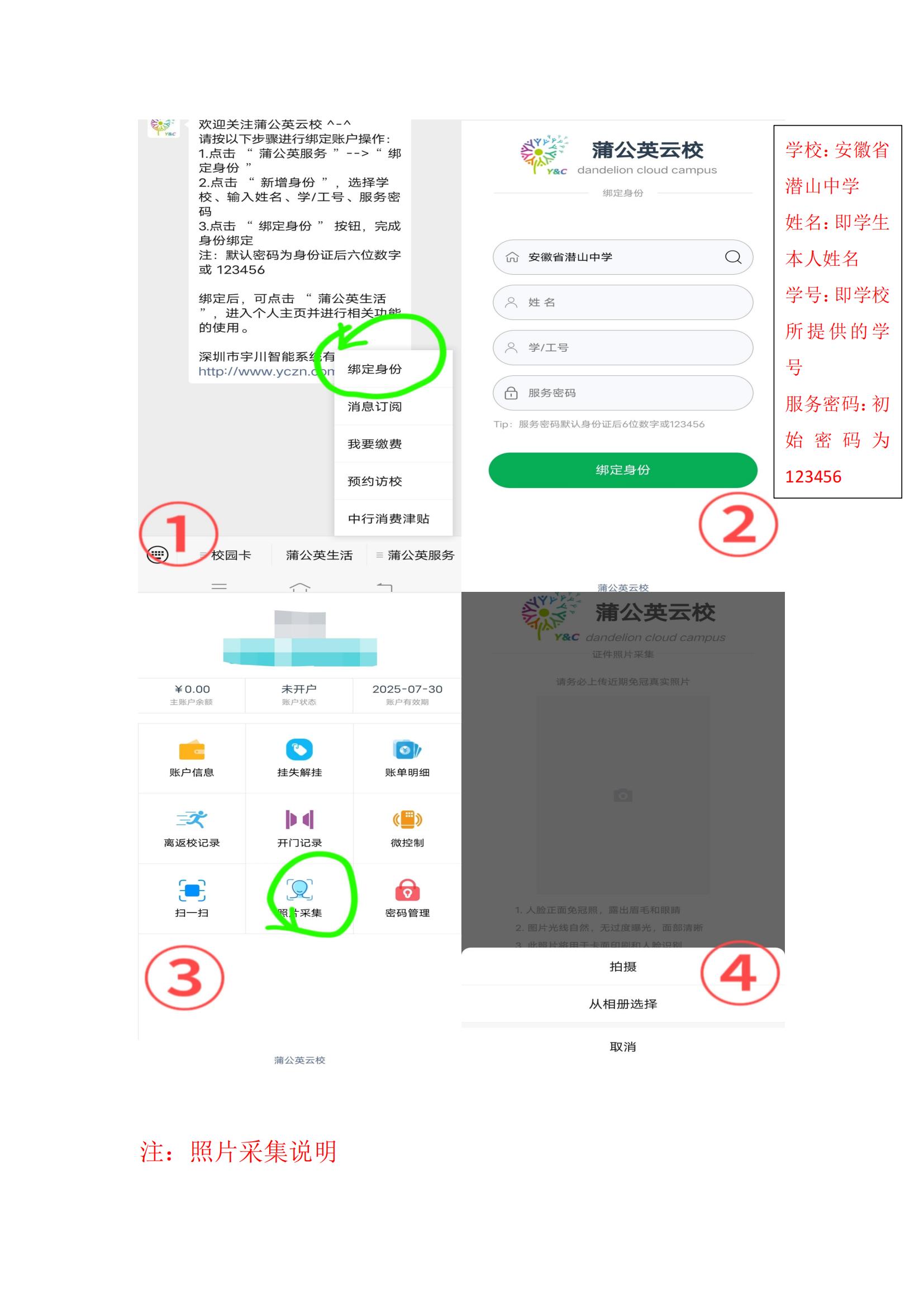 三、查询消费明细,在微信关注“蒲公英云校”微信公众号,录入人脸,按照下列步骤操作,孩子每笔消费家长都可以随时查询;