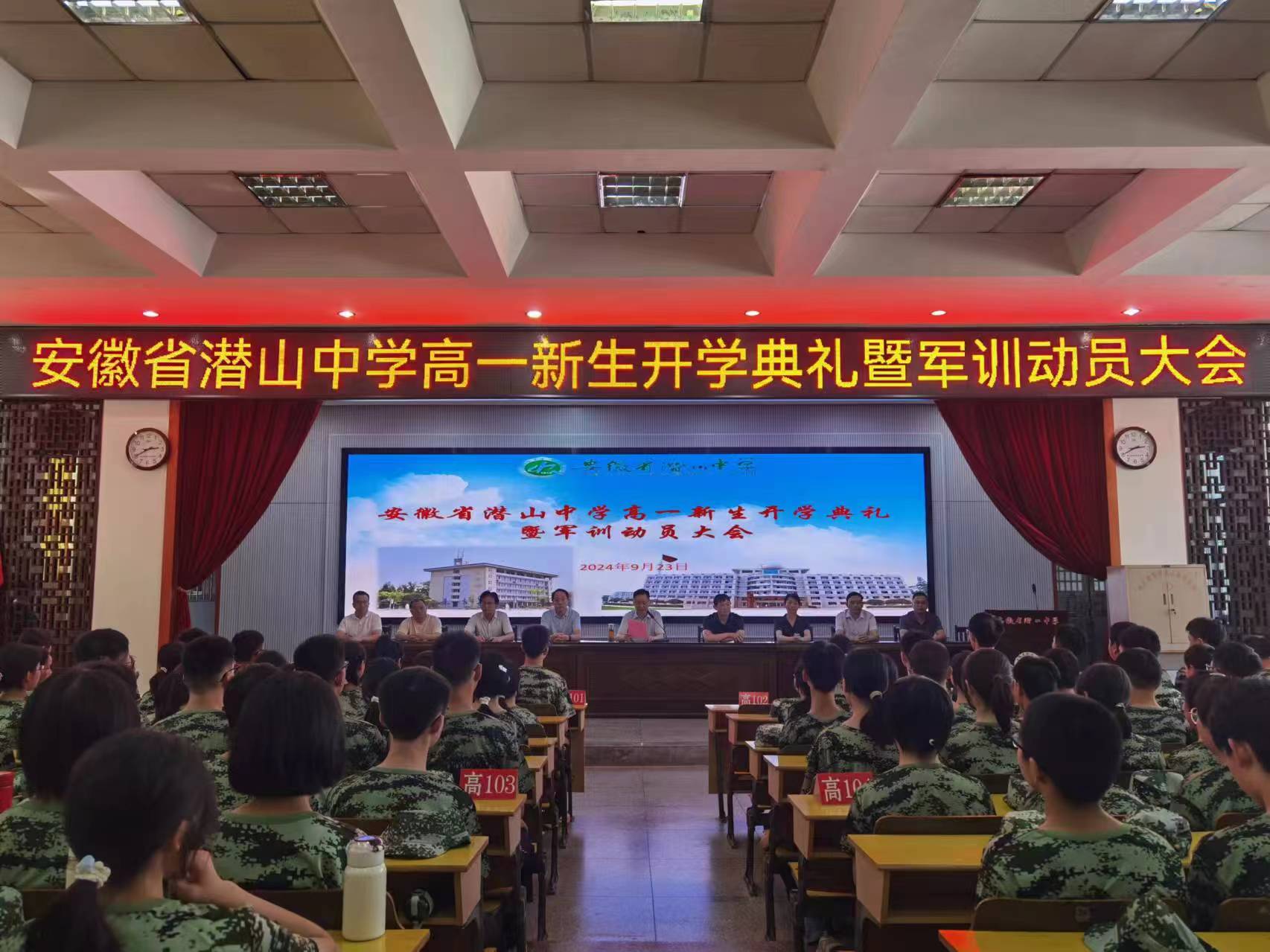 9月23日下午,潜山中学高一新生开学典礼暨军训动员大会在逸夫楼大礼堂隆重举行。党总支书记徐爱民和校级班子成员出席典礼,部分处室负责人、高一年级班主任和全体高一新生参加典礼。典礼由副校长朱小闯主持。