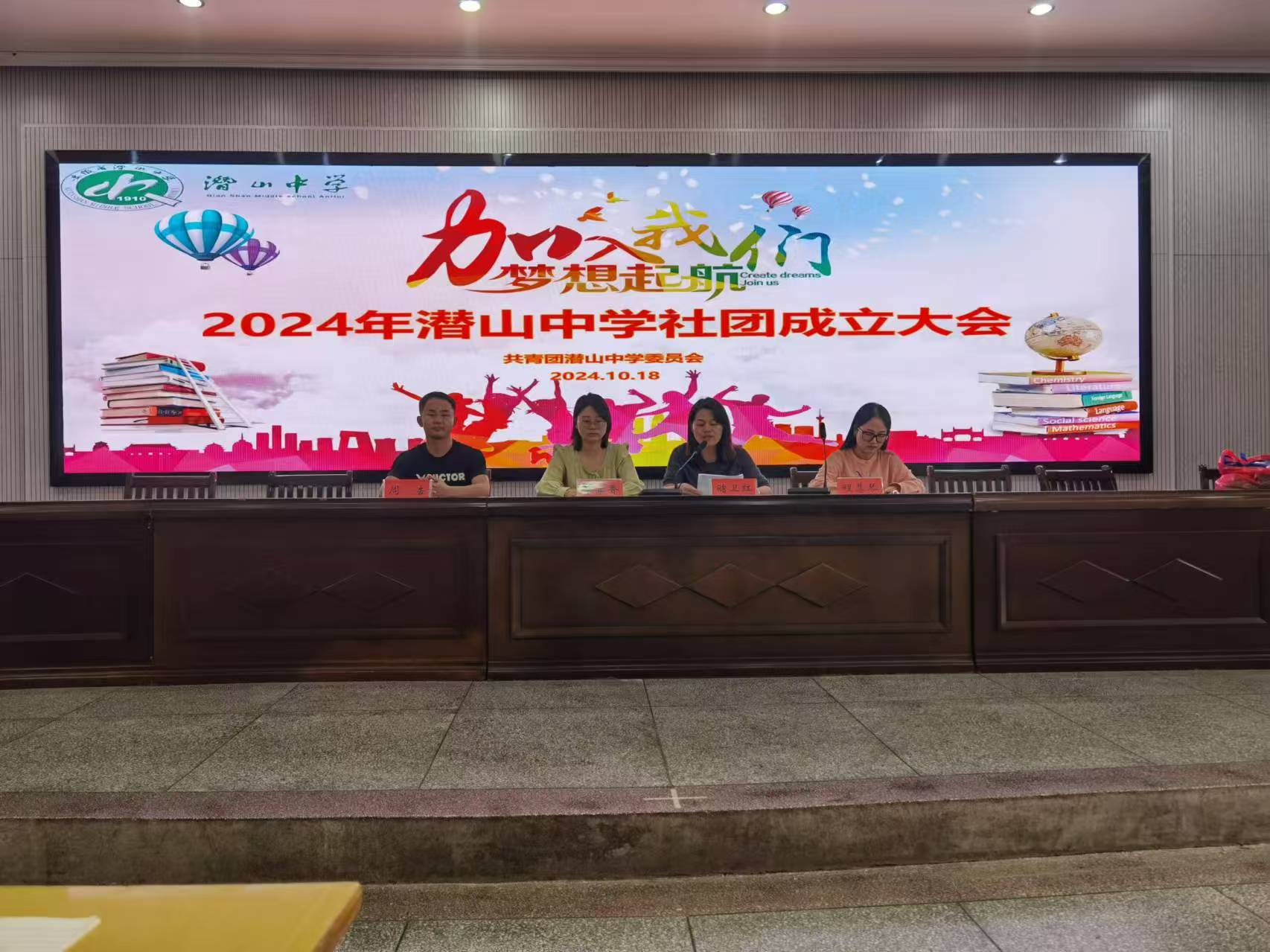 10月18日,潜山中学在逸夫楼一楼多媒体大厅举行学生社团成立大会。在团委、年级部和社团辅导老师的共同努力下,“鹿鸣文学社”“探秘地理社团”“化海畅游化学社”“遨游物理社团”“地衣生物社团”“探秘地理社团”五大学生社团正式成立。经班主任推荐,学生报名,团委审核,100名同学加入社团。