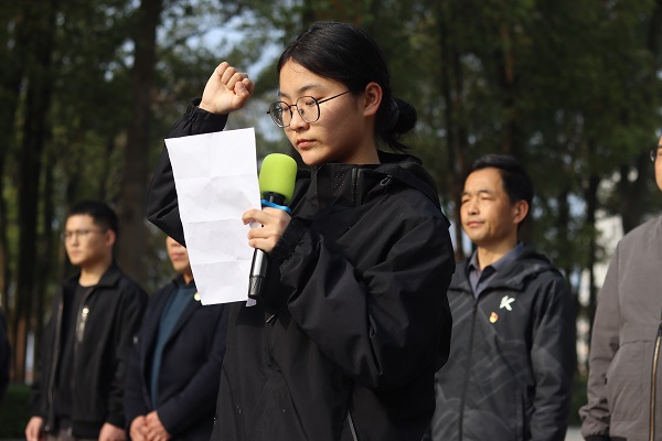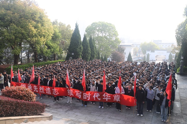 仪式在庄严肃穆的氛围中进行。主持人首先说明了本次活动的目的与意义。随后,全体人员肃立,向革命烈士默哀一分钟,表达深切哀思。高一(1)班学生代表向烈士纪念碑敬献花篮,校长朱春生上前整理缎带,以表达最崇高的敬意。随后,朱春生致辞,他追思家乡先烈的英勇事迹和崇高精神,希望同学们铭记先烈事迹,传承先烈精神。校党总支副书记叶群来带领全体党员教师重温入党誓词,学生代表高一(11)班程媛同学带领全体学生进行了庄严的集体宣誓。铮铮誓言在陵园上空回荡,表达了继承先烈遗志、奋发图强的坚定决心。最后,全体人员缓步绕行纪念碑一周,瞻仰革命烈士纪念碑,寄托无限哀思。