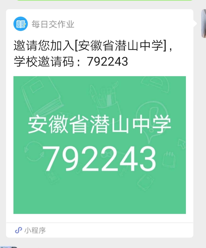 5、学生的作业问题。在企业微信的工作台有一个“教师助手”,点开后有下发作业功能,你可以把作业编辑成文本以附件发送,也可以拍成照片发送,家长在“家长助手”就能收到消息,但这只是一个下发的功能,不能回收作业批改。回收作业,恐怕只能让学生在企业微信上私发给相应学科的老师进行批改。另外推荐使用“每日交作业”微信小程序,进行每天的作业收发和批改。点开小程序,老师输入邀请码792243,输入自己所带班级和学科注册,生成自己的邀请码,再发到班级微信群(只能是微信群,企业微信不行,无法使用小程序),家长根据老师的邀请码加入即可完成收发作业。
