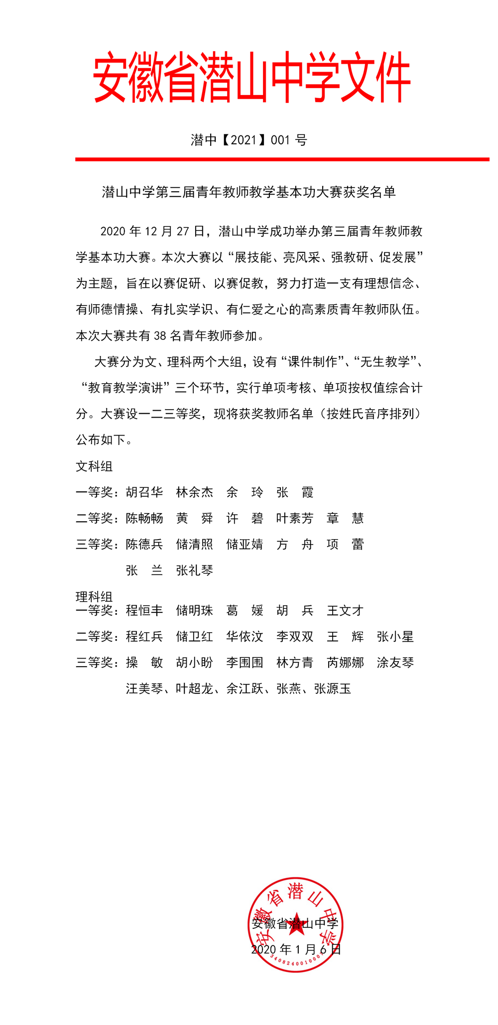 潜山中学第三届青年教师教学基本功大赛已圆满落下帷幕,经统分组统计、大赛组委会复核,现将获奖名单(按姓氏音序排列)公布如下。
