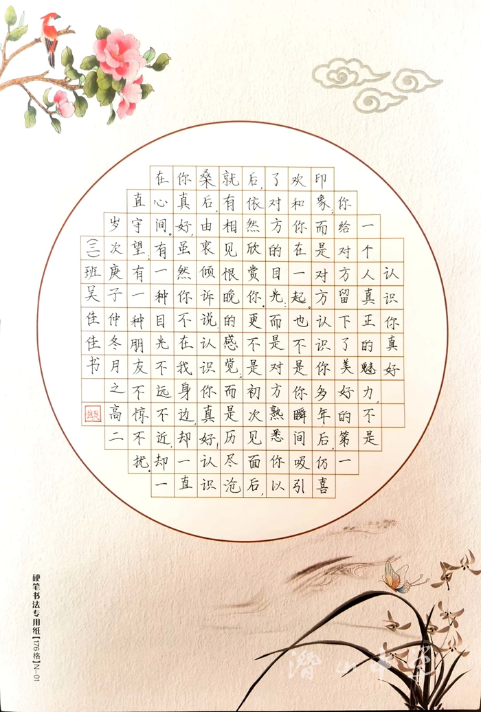 本次比赛分为班级初赛、现场书写决赛两个环节。经过各班选拔,共42名选手参加现场书写比赛,其中3名选手现场进行软笔书法作品展示。孙志坚、江涛、葛良义老师担任评委,评选出一等奖4名、二等奖6名、三等奖10名及优秀班级奖。